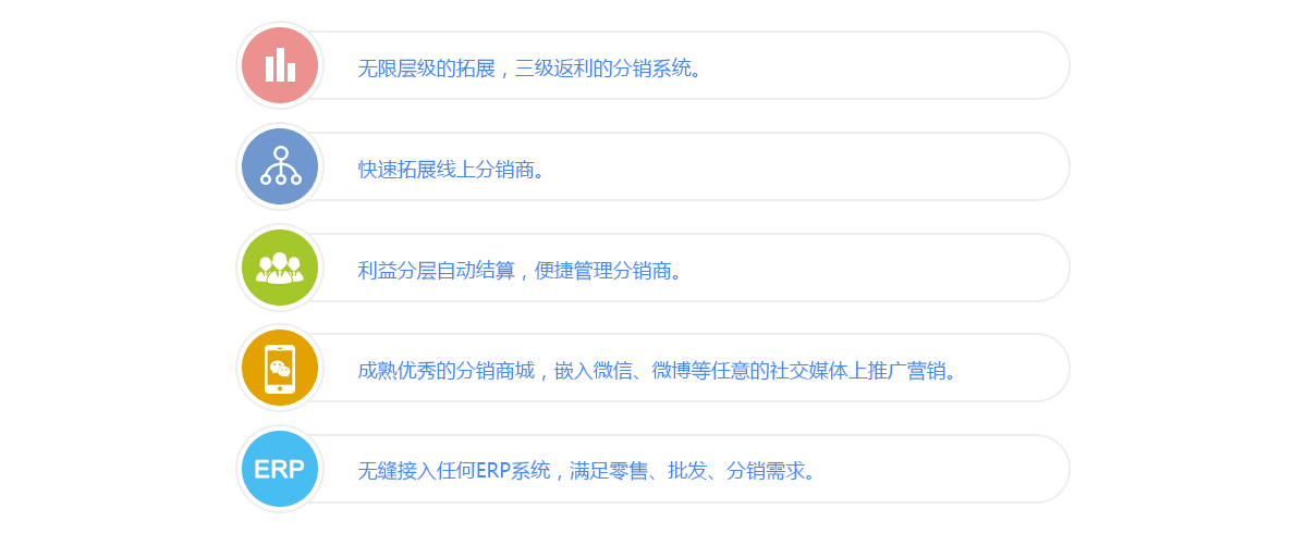 分銷系統(tǒng)是一款“微商城+三級分銷+代理”多層級的微信分銷成交平臺。基于微信朋友圈等社交媒體的傳播輕松帶領(lǐng)成千上萬的微信用戶一起為商家銷售產(chǎn)品,裂變獲客,銷量爆漲。強大穩(wěn)定的系統(tǒng)+獨特的分銷模式+優(yōu)秀的運營=裂變賺錢機器!